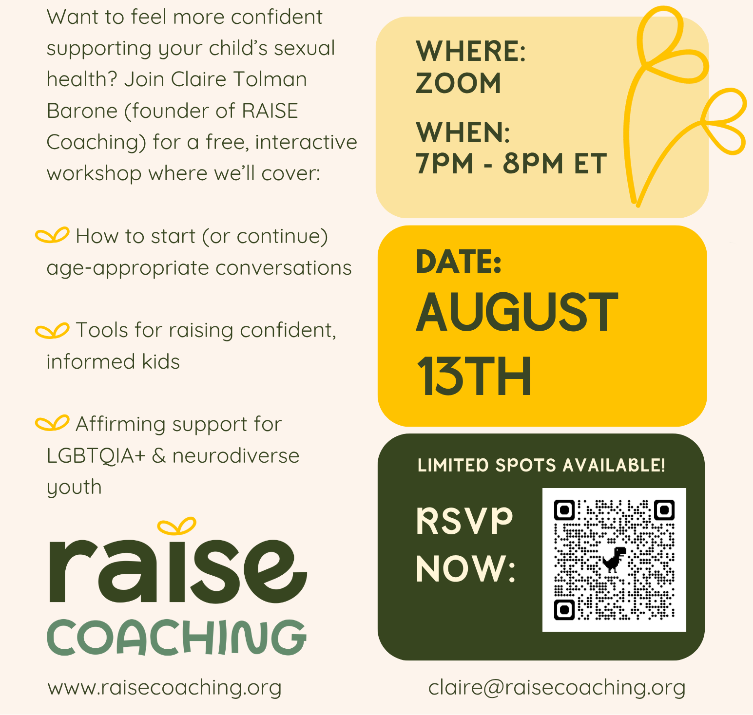 In this free interactive workshop, Claire Tolman Barone (founder of RAISE Coaching) will share practical tools and insights to help you: