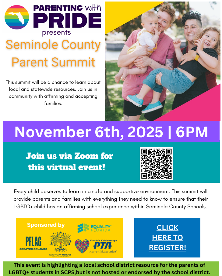 Every child deserves to learn in a safe and supportive environment. This summit will provide parents and families with everything they need to know to ensure that their LGBTQ+ child has an affirming school experience within Seminole County Schools.