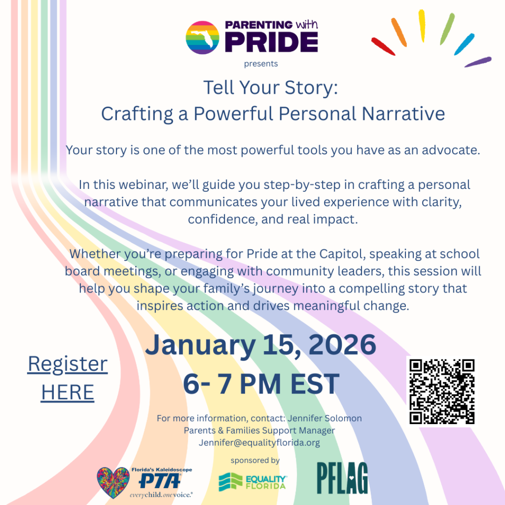 In this webinar, we’ll guide you step-by-step in crafting a personal narrative that communicates your lived experience with clarity, confidence, and real impact. Whether you’re preparing for Pride at the Capitol, speaking at school board meetings, or engaging with community leaders, this session will help you shape your family’s journey into a compelling story that inspires action and drives meaningful change.